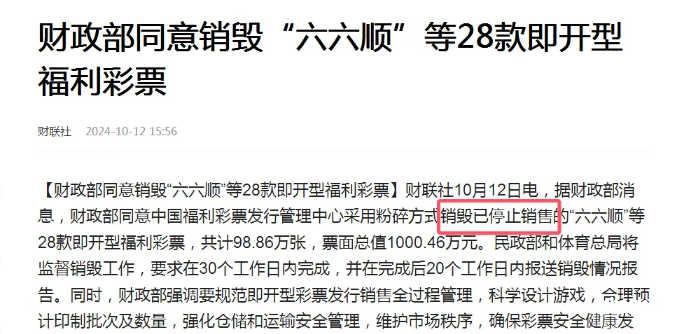 据财联社10月12日称,“财政部同意中国福利彩票发行管理中心采用粉碎方式,销毁已停止销售的“六六顺”等28款即开型福利彩票,共计98.86万张,票面总值1000.46万元。民政部和体育总局将监督销毁工作,要求在30个工作日内完成,并在完成后20个工作日内报送销毁情况报告……”